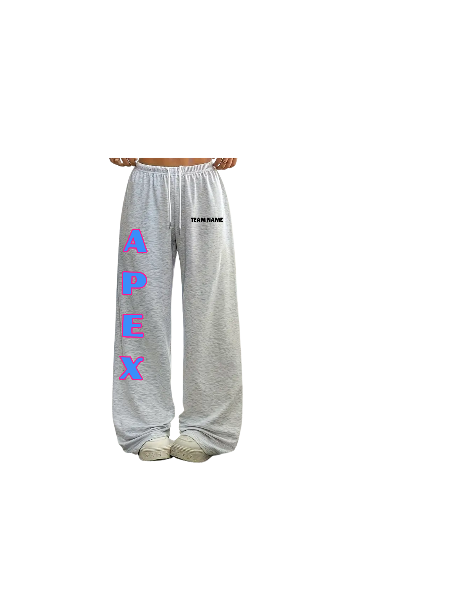 Step into ultimate comfort and team pride with the Apex Team Pants — the perfect blend of cozy and fierce. These wide-leg sweatpants feature bold APEX lettering down the leg in electric blue with a pink outline, bringing a pop of energy to your look. The customizable TEAM NAME detail on the hip adds a personalized touch, making them perfect for representing your crew in style.